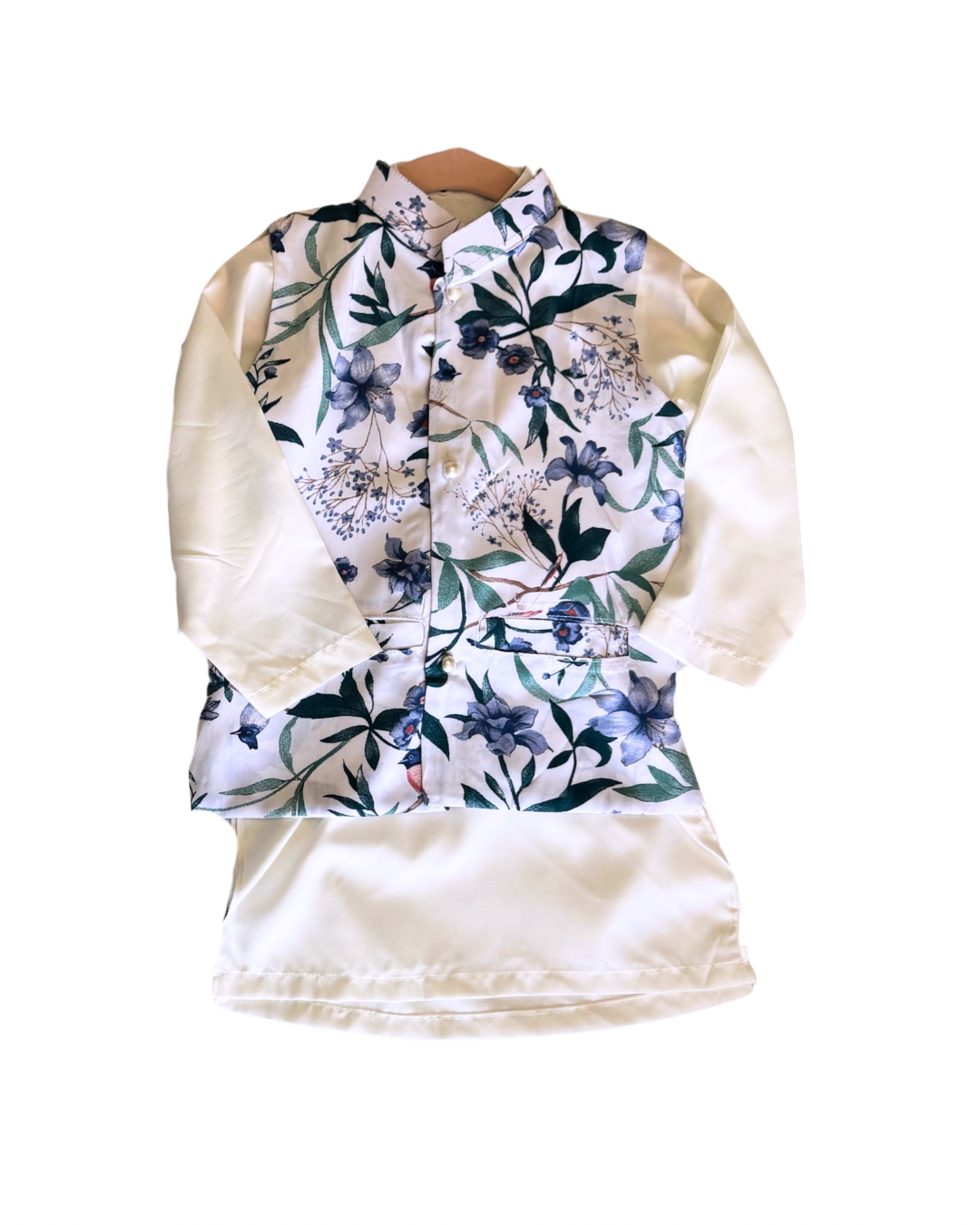 Azure Breeze Boys’ Koti Set (3-Piece) – A stylish and breathable traditional outfit crafted from soft cotton for all-day comfort. This set includes a kurta, matching bottoms, and a coordinating koti (vest) for a classic look. Perfect for festive occasions, it pairs beautifully with our Azure Breeze Girls’ Co-ord Set for a charming sibling match!